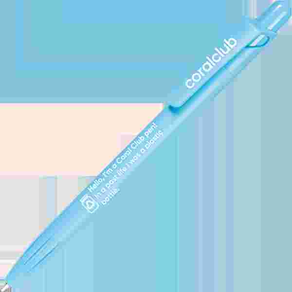 Pix cu bilă și mecanism cu buton, din material PET-RECYCLED cu inscripția „Salut, sunt pixul Coral Club! Într-o viață anterioară am fost sticlă din plastic”.