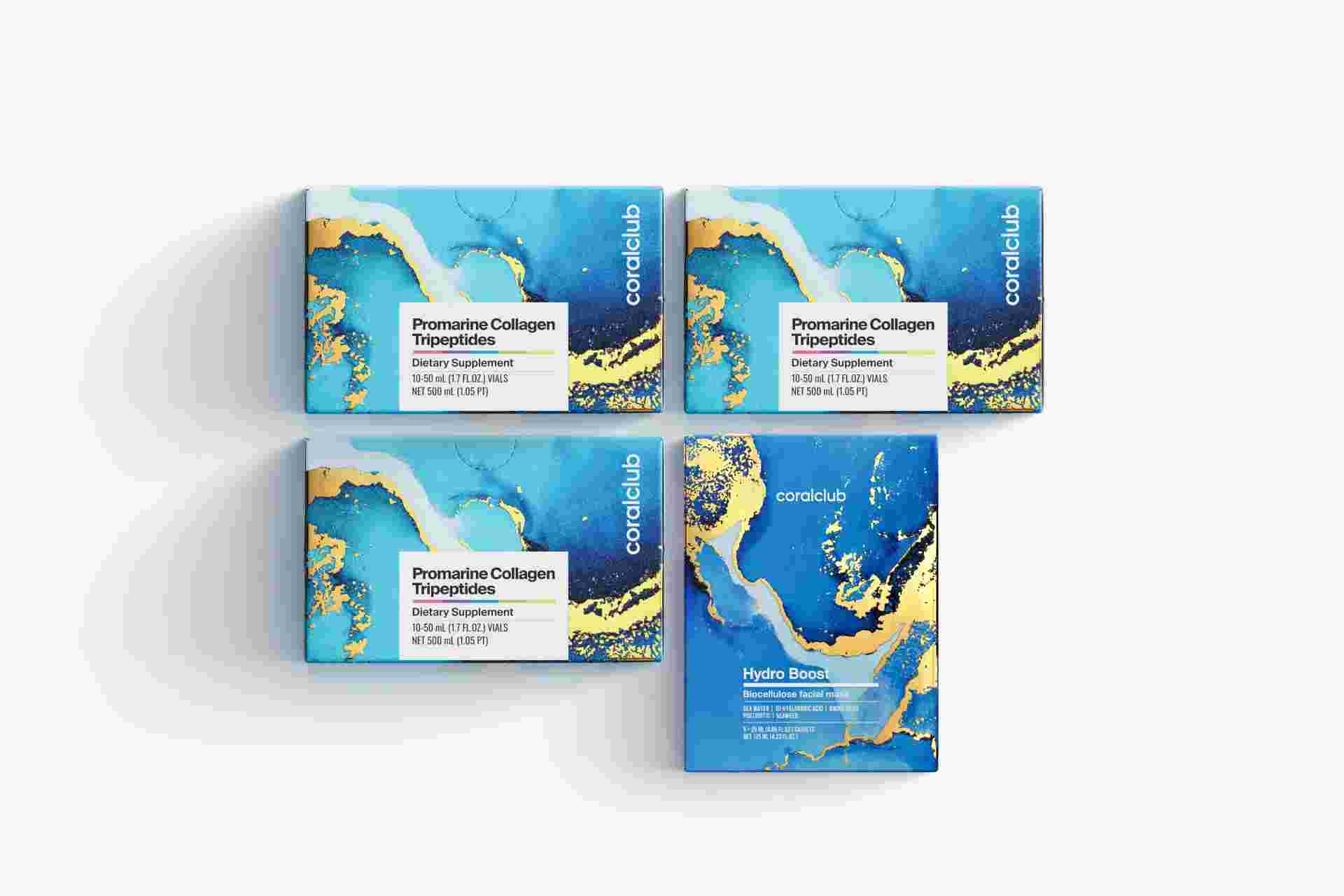 Set Promarine Collagen Tripeptides (cură de 1 lună) și măști faciale din bioceluloză Hydro Boost (5 bucăți)